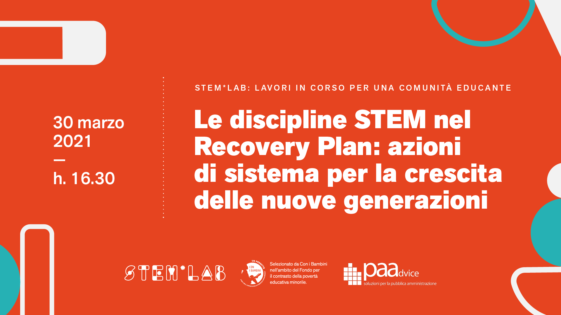 Il 30 marzo p.v. alle ore 16.30 ci sarà il webinar del progetto STEMLab organizzato dalla Campania sul tema "LE DISCIPLINE STEM NEL RECOVERY PLAN: azioni di sistema per la crescita delle nuove generazioni", nell'ambito del ciclo di webinar promossi con il progetto a livello nazionale.