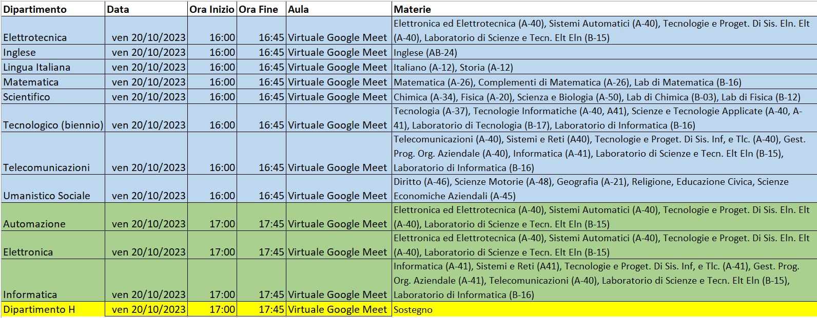Venerdì 20 ottobre 2023 tutti i docenti del diurno si riuniranno a distanza sulla piattaforma scolastica di Google Meet per la ratifica delle programmazioni di dipartimento secondo il calendario in allegato.