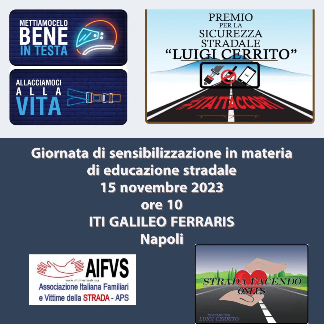 Mercoledì 15 novembre 2023- alle ore 10,00 presso l’ Auditorium “G. ESPOSITO” si terrà la giornata di sensibilizzazione in materia di sicurezza stradale. l’ITI Galileo Ferraris di concerto con l’associazione “Strada Facendo ONLUS” insieme per Luigi Cerrito promuove la giornata di sensibilizzazione in materia di sicurezza stradale in occasione DELLA CELEBRAZIONE della giornata mondiale del ricordo delle vittime della strada prevista per la terza domenica di novembre. All'evento parteciperanno le classi 2D-2P-4C-4F-4P-5B-5R.
