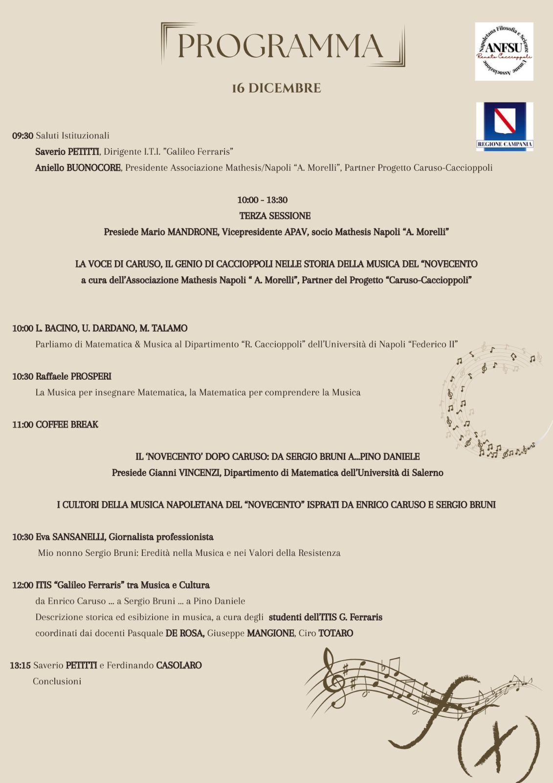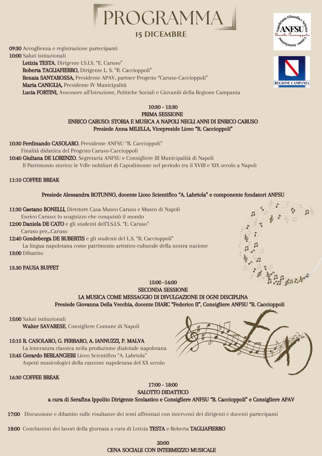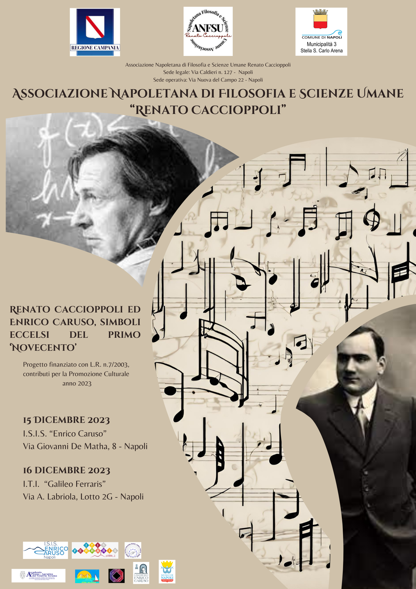 Nell’ambito del Progetto approvato dalla regione Campania in onore del 150-esimo anniversario della nascita del tenore Enrico Caruso, l’Associazione Napoletana di Filosofia e Scienze Umane “R. Caccioppoli”, ha organizzato un Convegno che si terrà a Napoli, all’I.I.S. “E. Caruso” nel giorno 15 ed all’ITIS “G. Ferraris” nel giorno 16 dicembre 2023, come da dettagli in programma allegato.